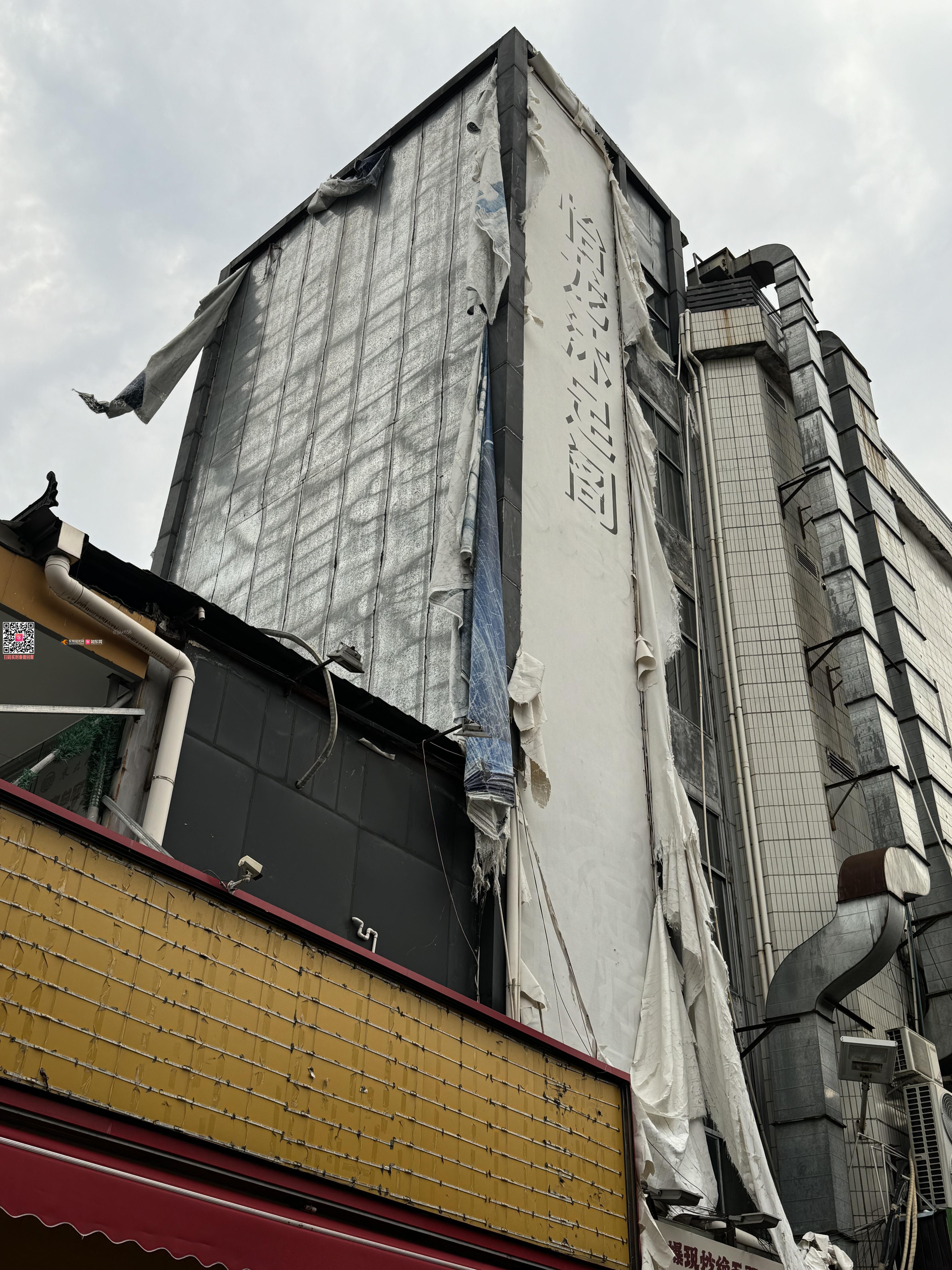 东莞市南城区城市风景街区绿榕街(怡龙沐足阁)存在以下安全隐患: 一、广告布破损问题(图1、2) 建筑外墙广告布严重破损、大面积脱落,部分材料随风飘扬。存在高空坠物风险,威胁行人安全,且影响市容市貌。要求立即拆除或更换破损广告布,消除安全隐患。 二、铁皮封窗抗风问题(图3) 建筑外立面使用轻质铁皮材料封闭窗户,固定方式简陋。遇大风暴雨天气极易发生脱落、飞散,造成人身伤害和财产损失。要求更换为符合抗风标准的固定材料,或采取有效加固措施。 诉求核心:两项隐患均涉及高空坠物风险,请主管部门领导督促责任方限期整改,保障公共安全。