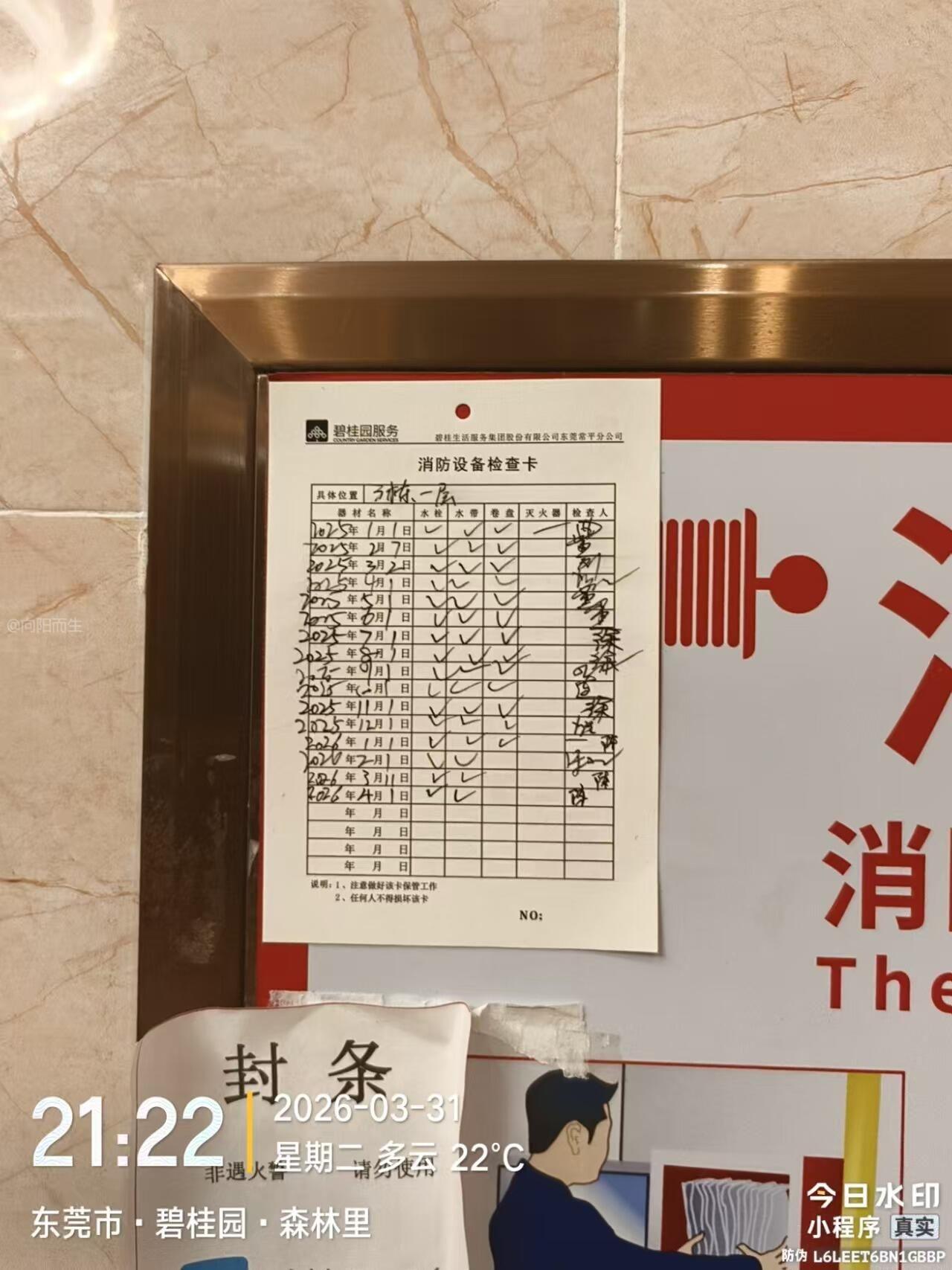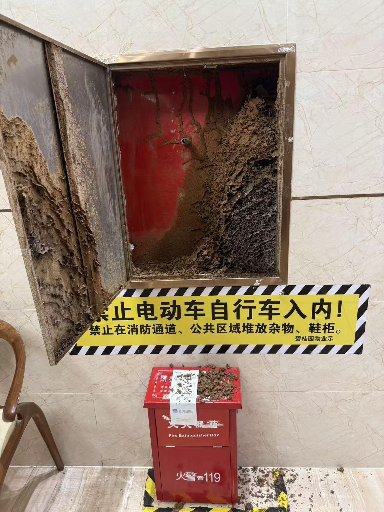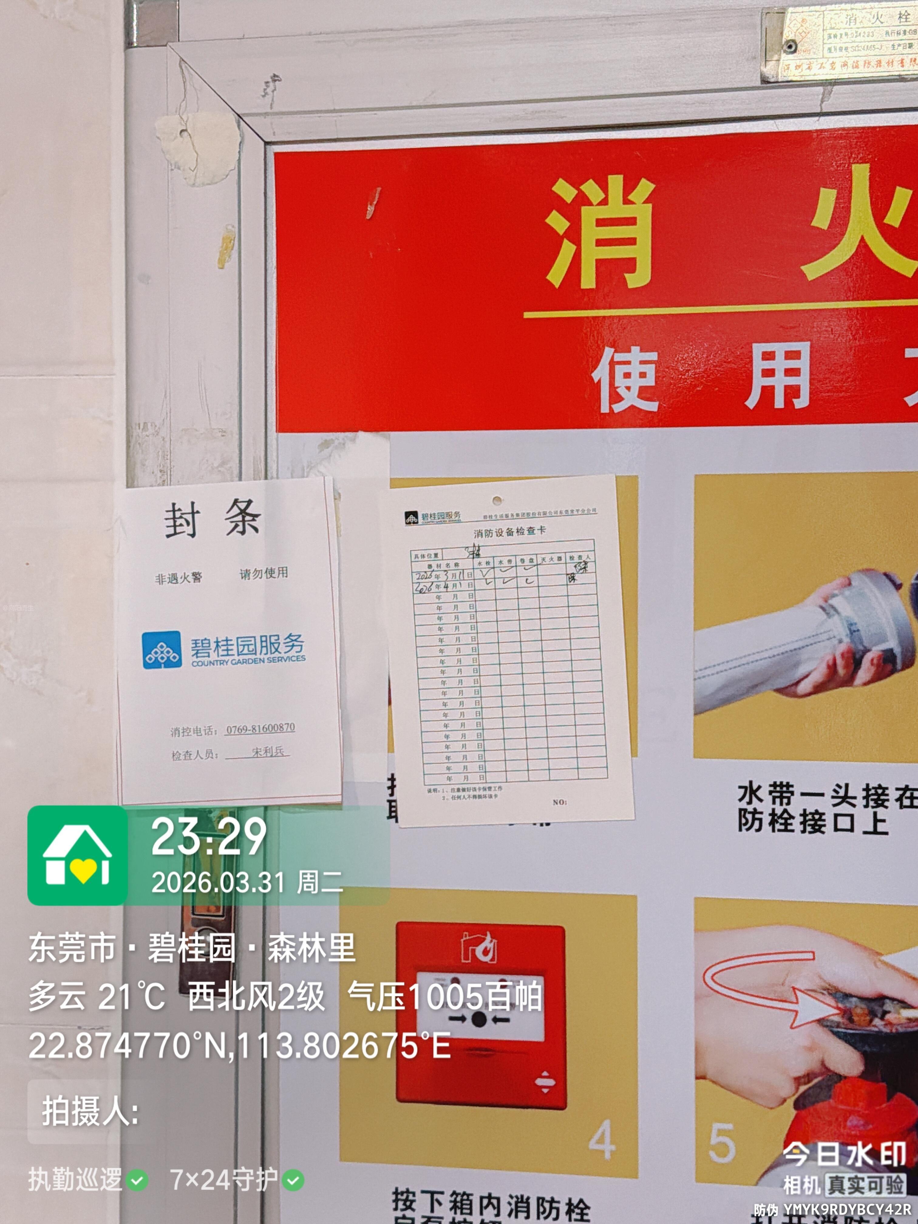 本人是东莞碧桂园森林里小区的业主,现就本小区碧桂园物业服务有限公司长期不作为、虚假履职,放任消防设施失效,漠视全体业主生命财产安全一事,正式向贵部门实名举报,恳请消防救援、住建等相关部门立即介入调查,依法严惩违规行为,责令物业限期整改,切实筑牢小区消防安全防线,保障全体业主的合法权益。 昨晚(3月31日),我和邻居们发现,6栋一楼的消防箱被白蚁严重蛀空,箱体破损不堪、结构松散,部分箱体已无法正常开启,内部消防水带、水枪等核心配件缺失或老化失效,完全丧失灭火应急功能,无法应对突发火灾事故,给全体业主的生命财产安全埋下重大隐患。此事件并非个例,我们发现2栋、3 栋、6栋有多处消防栓箱水带和接口完全分离,箱内积灰锈蚀严重等问题,丧失了火灾应急功能,形同虚设。但物业张贴的《消防设备检查卡》中,不仅将该失效设备标注为 “合格”,甚至提前签好了 2026 年 4 月 1 日的巡检记录,属于伪造检查记录、隐瞒重大火灾隐患,典型的弄虚作假。 碧桂园物业作为小区消防安全管理的责任主体,未履行法定巡检职责,未及时排查消防隐患,反而通过伪造记录、虚假打卡的方式,掩盖其履职缺位的事实,欺骗业主、逃避监管。碧桂园物业的上述行为,已严重违反相关法律法规,履职严重缺位,漠视全体业主生命安全,涉嫌违规违法。 为此,本人郑重提出以下诉求:一是恳请相关部门立即介入调查,对碧桂园物业虚假巡检、伪造台账、不作为的违规行为依法从严查处,公示处罚结果,严肃追究相关责任人责任;二是责令碧桂园物业立即组织专业人员,对小区所有消防设施进行全面排查,限期更换被白蚁蛀空的消防箱及失效配件,彻底整改所有消防隐患;三是要求物业公开消防巡检台账和整改方案,定期向业主公示整改进度,接受全体业主监督;四是要求碧桂园物业就其违规行为向全体业主作出书面道歉,承担相应的责任。
